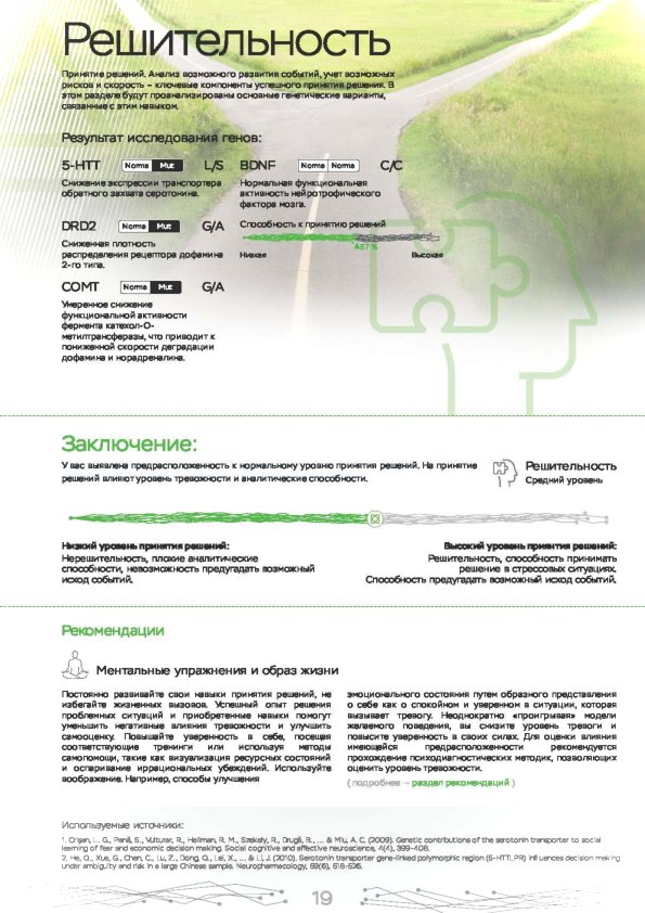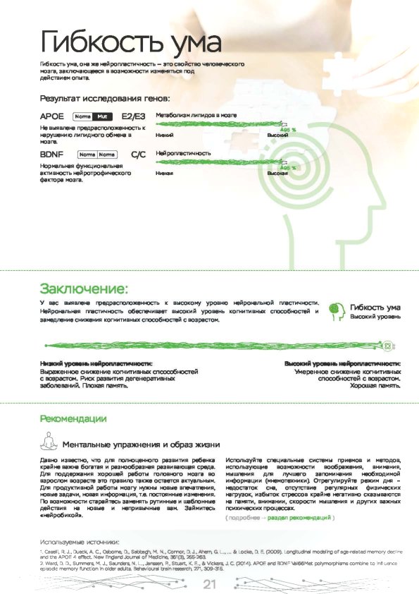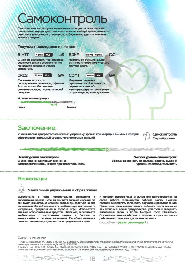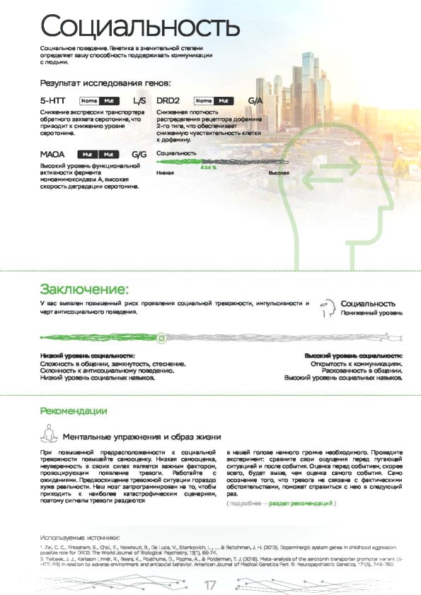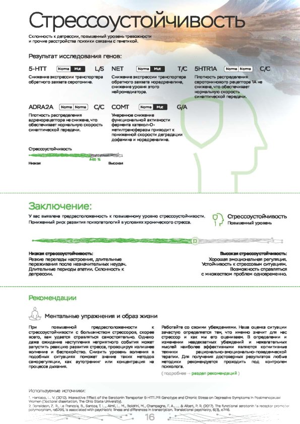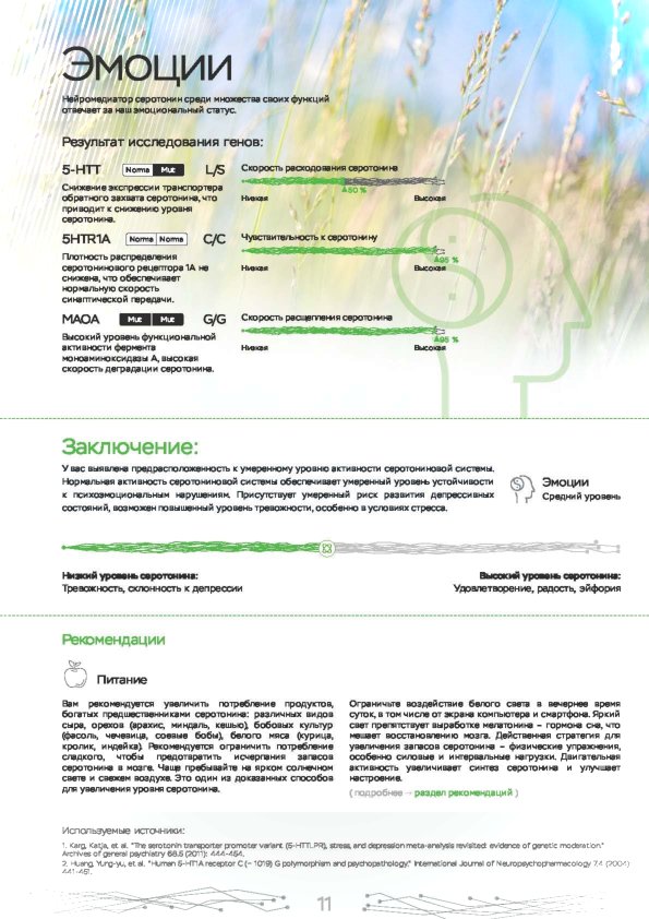 Этот ДНК анализ показывает влияние наиболее важных 10 генов на психическое и эмоциональное состояние. Именно они регулируют выработку гормонов, работу нейромедиаторов. Используйте знания о природных свойствах своего организма для борьбы со стрессом, повышения работоспособности и общего тонуса. Каждый человек индивидуален, поэтому мы рекомендуем пройти наш генетический нейро тест в Полысаево.