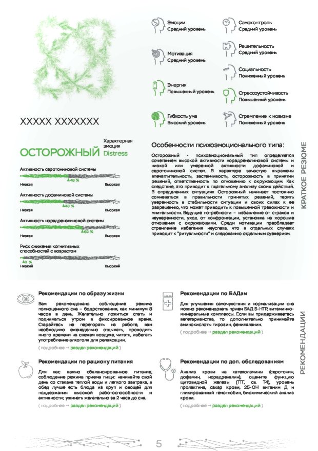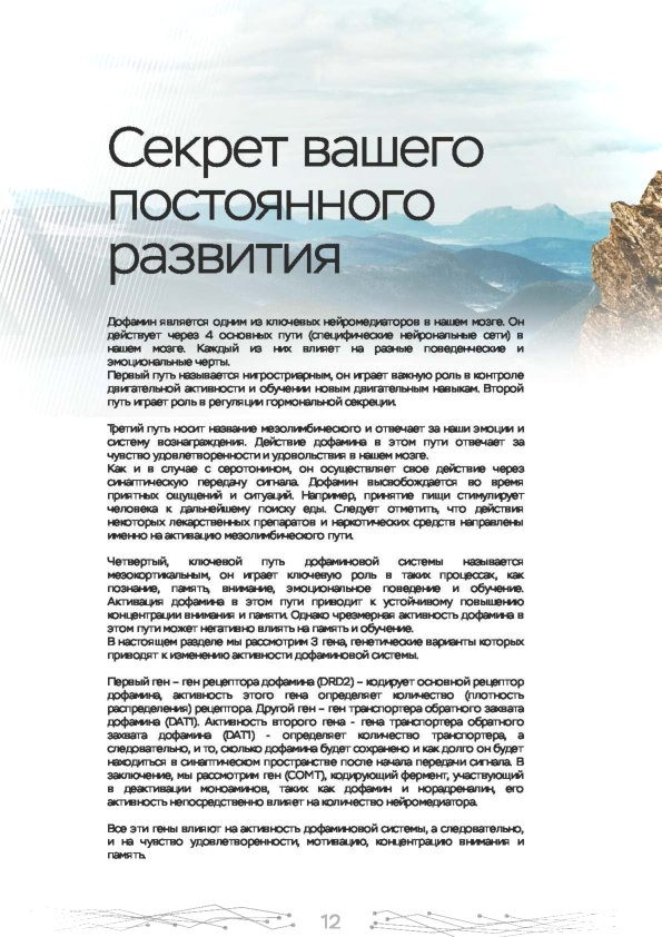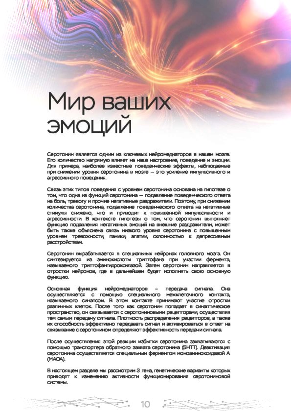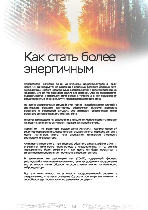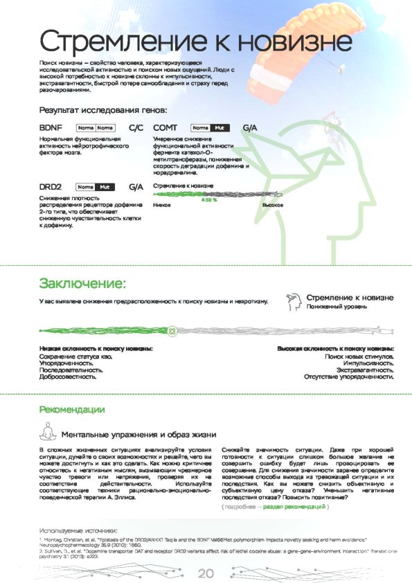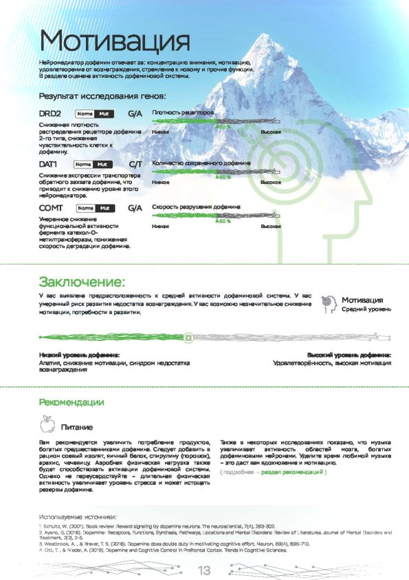 Этот ДНК анализ показывает влияние наиболее важных 10 генов на психическое и эмоциональное состояние. Именно они регулируют выработку гормонов, работу нейромедиаторов. Используйте знания о природных свойствах своего организма для борьбы со стрессом, повышения работоспособности и общего тонуса. Каждый человек индивидуален, поэтому мы рекомендуем пройти наш генетический нейро тест в Полысаево.