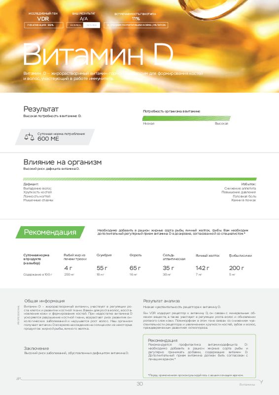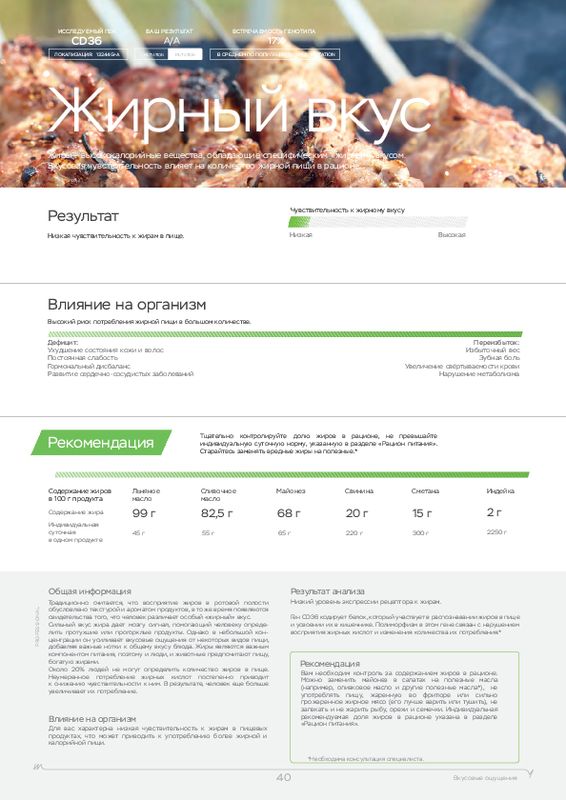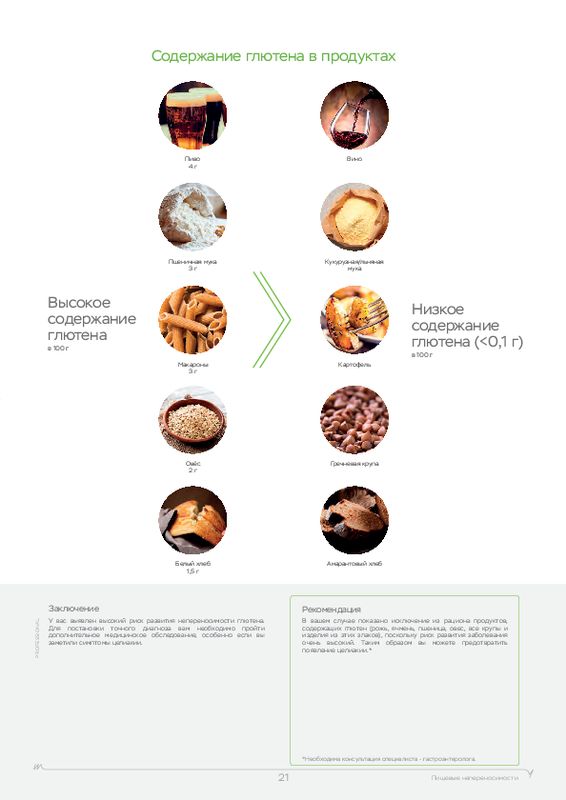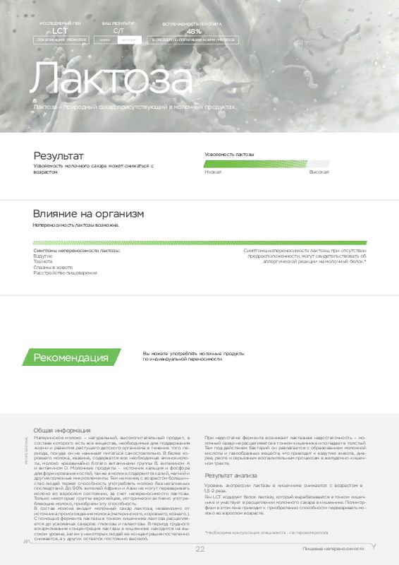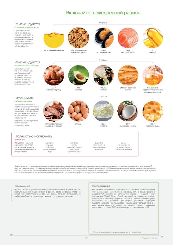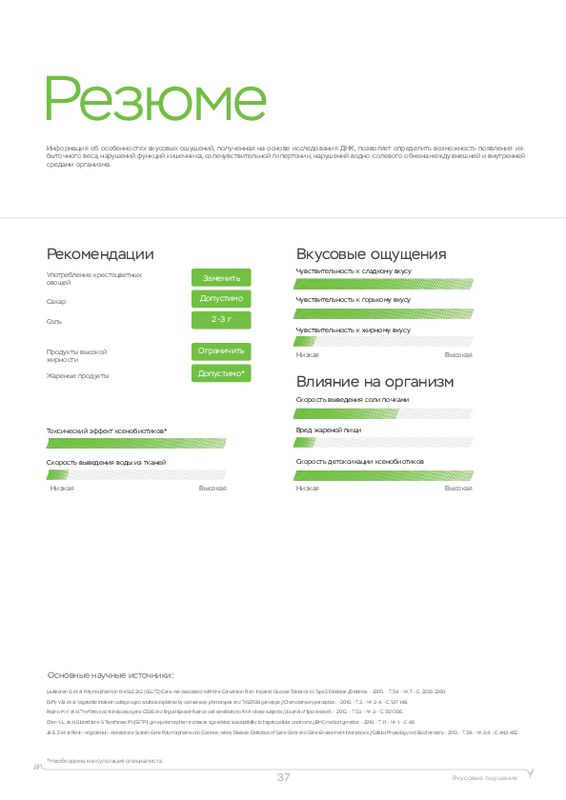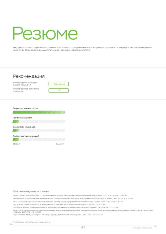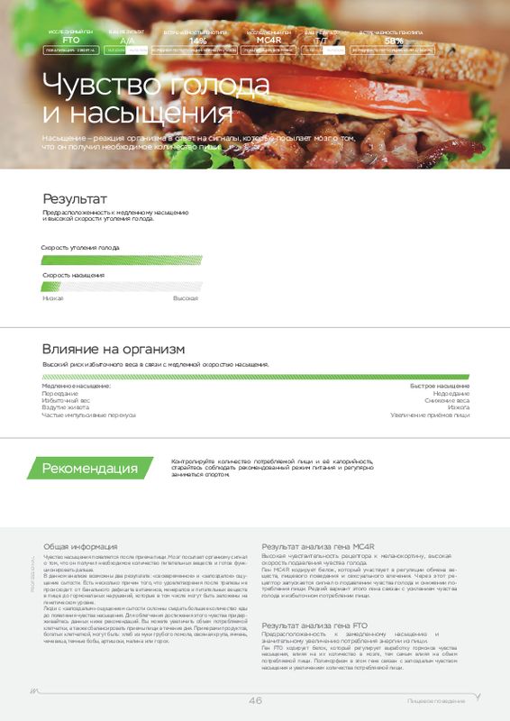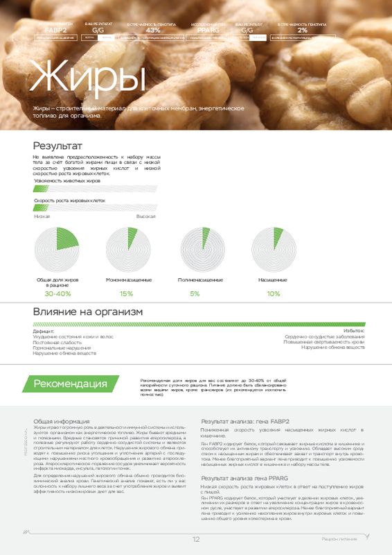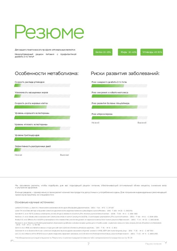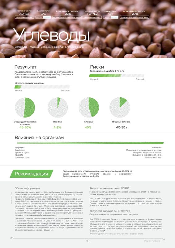 В заключении будет информация о продуктах, которые стоит избегать или, наоборот, включить в рацион. По результатам ДНК-исследования рекомендовано проконсультироваться с эндокринологом или диетологом.
