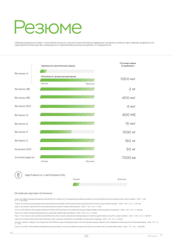 Тест показывает, есть ли предрасположенность к дефициту/избытку витаминов и предлагает рекомендации по питанию и приему витаминов.